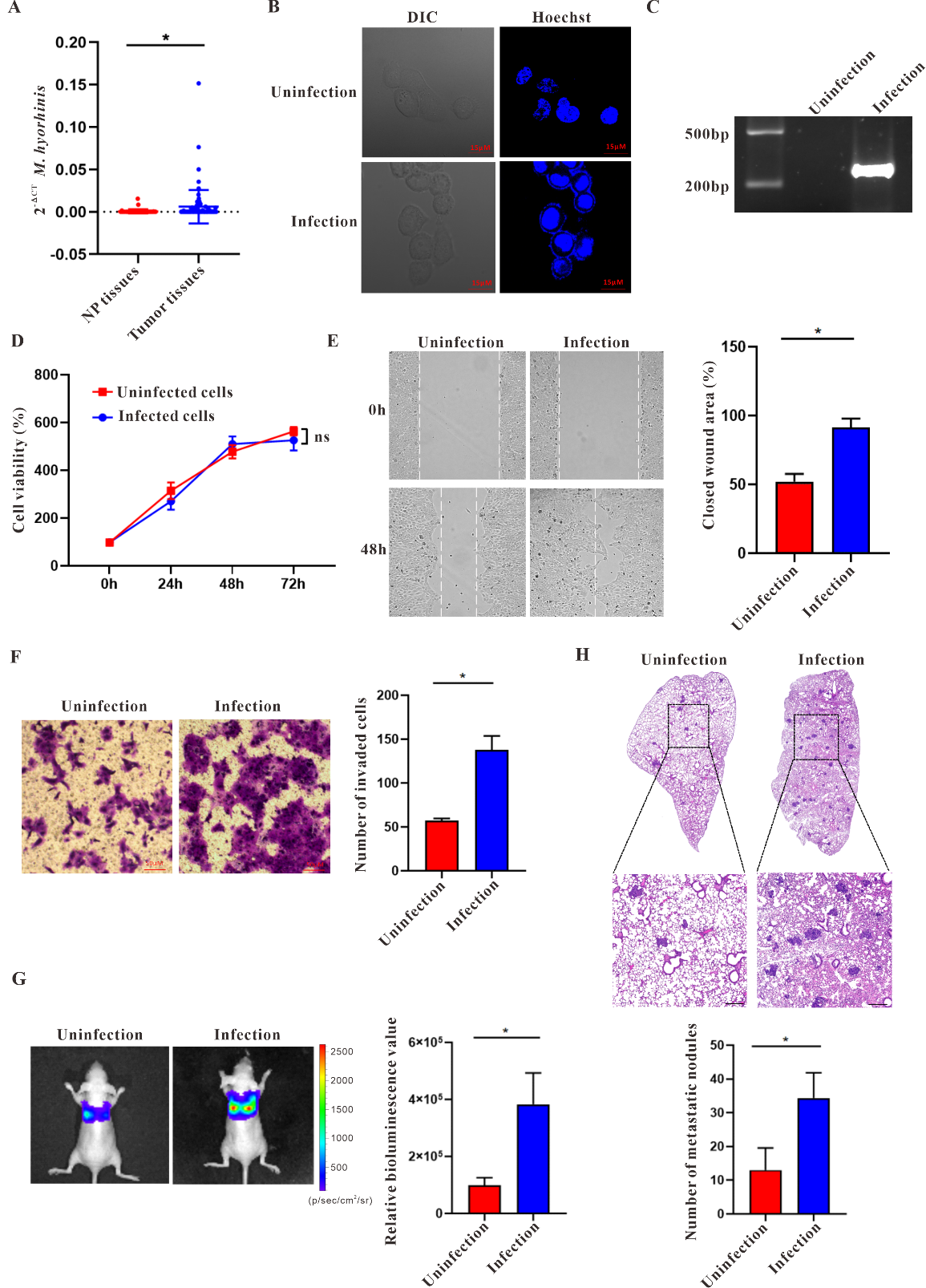 ,可寄生在人体中,引起长期感染和炎症。先前的研究表明,支原体感染存在于多种人类肿瘤中[2]。其中,猪鼻支原体(Mycoplasma hyorhinis)在肿瘤组织中最常见,可诱导前列腺细胞恶性转化[3],促进胃癌、肝癌侵袭转移[4]、诱导肿瘤干性[5],导致抗肿瘤药物多药耐药[6]。已有报道明确食管癌中存在猪鼻支原体感染[2],但是其在食管癌中的功能作用尚不清楚。研究团队首先通过PCR证实食管癌组织中存在猪鼻支原体的感染。利用构建的猪鼻支原体感染的细胞模型,证明猪鼻支原体感染可在体外增强食管鳞状细胞癌细胞的迁移和侵袭能力,促进食管鳞状细胞癌细胞在小鼠体内的肺转移(图1)。